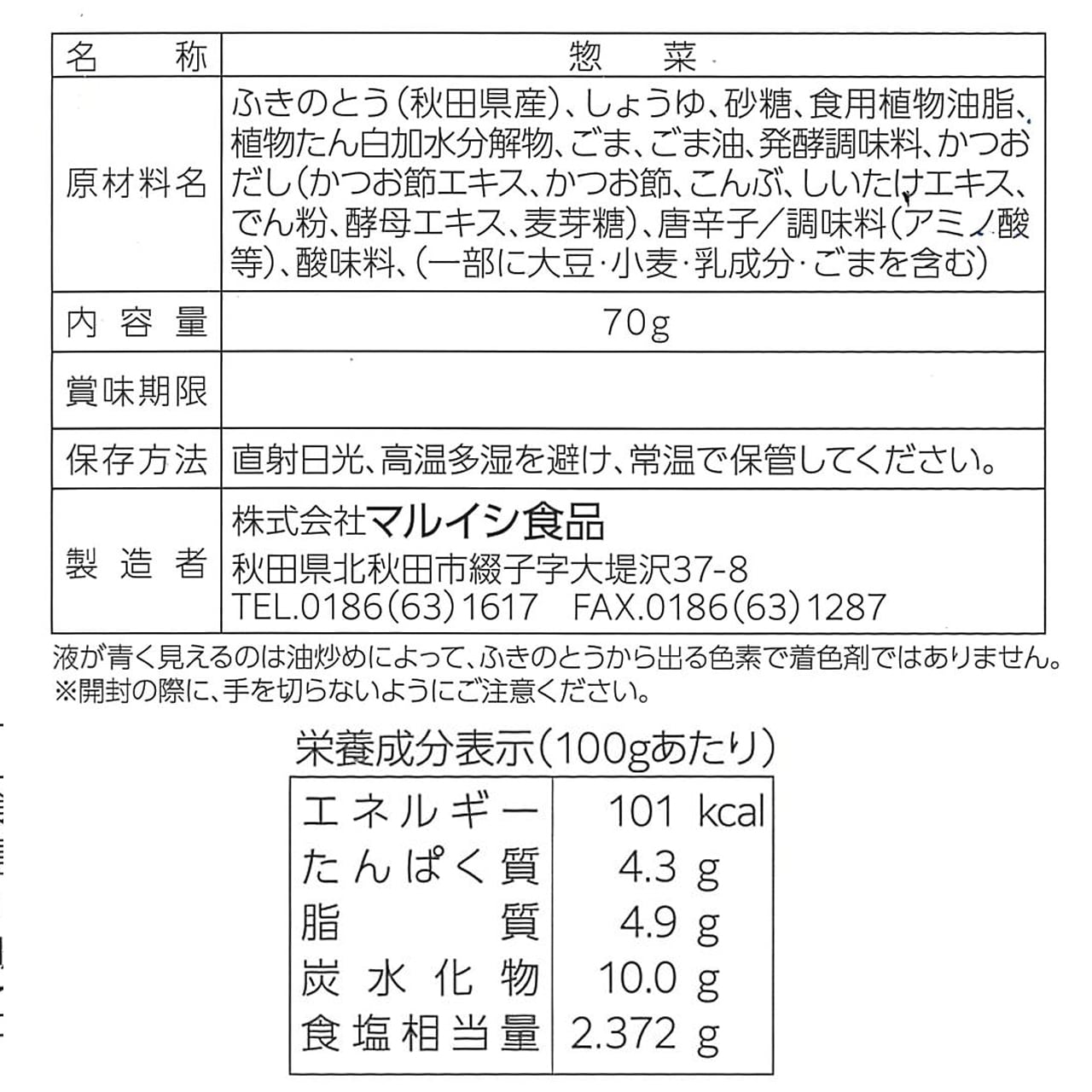 原材料名:ふきのとう(秋田県産)、醤油、砂糖、食用植物油脂、植物たん白加水分解物、胡麻、ごま油、発酵調味料、かつおだし(かつお節エキス、かつお節、こんぶ、しいたけエキス、でん粉、酵母エキス、麦芽糖)、唐辛子、調味料(アミノ酸等)、酸味料